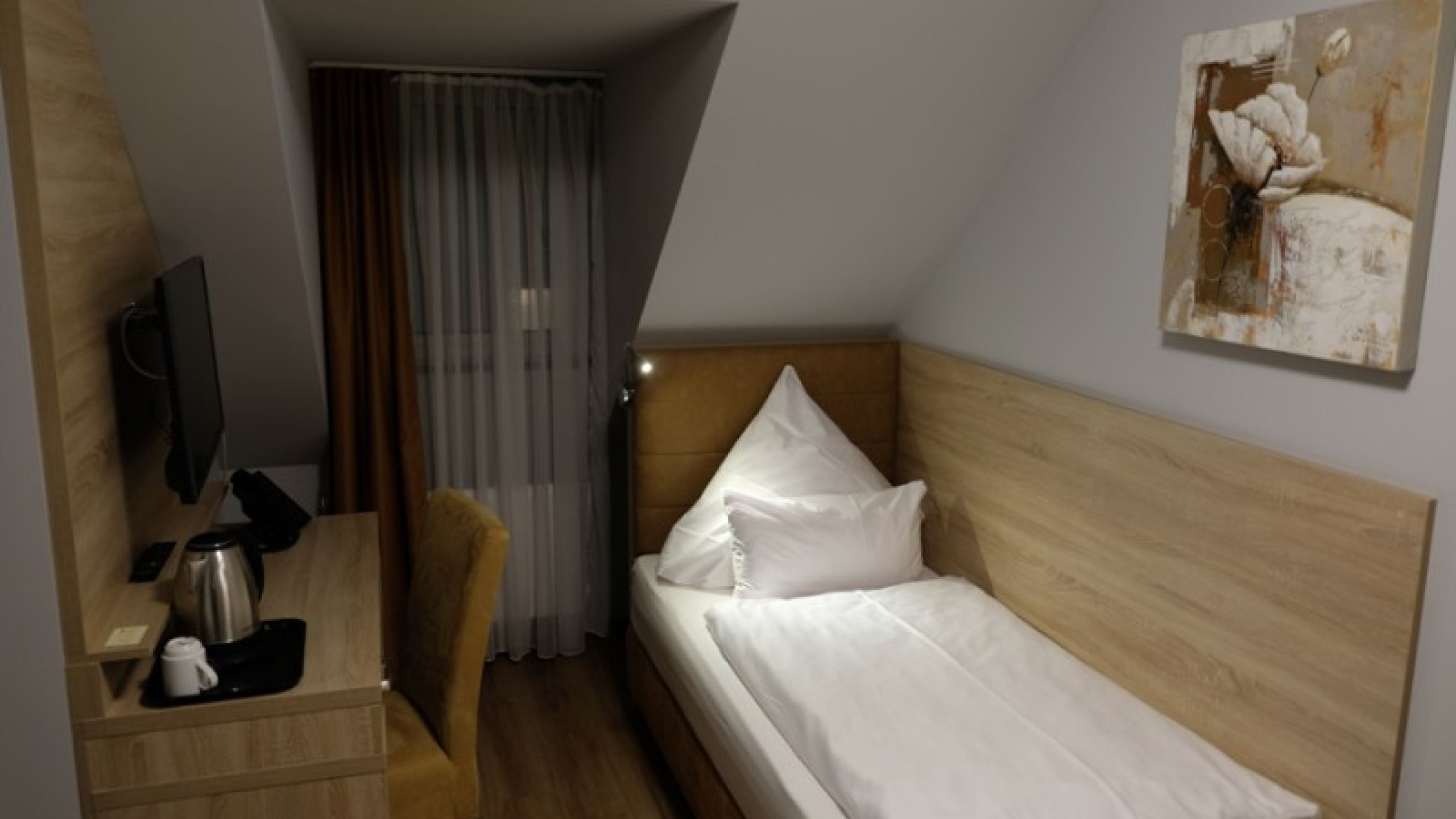 Modern furnished single rooms (about 14 m²), located on the street side, equipped with a box spring bed. An electric kettle is available, as well as a standing fan in the summer.