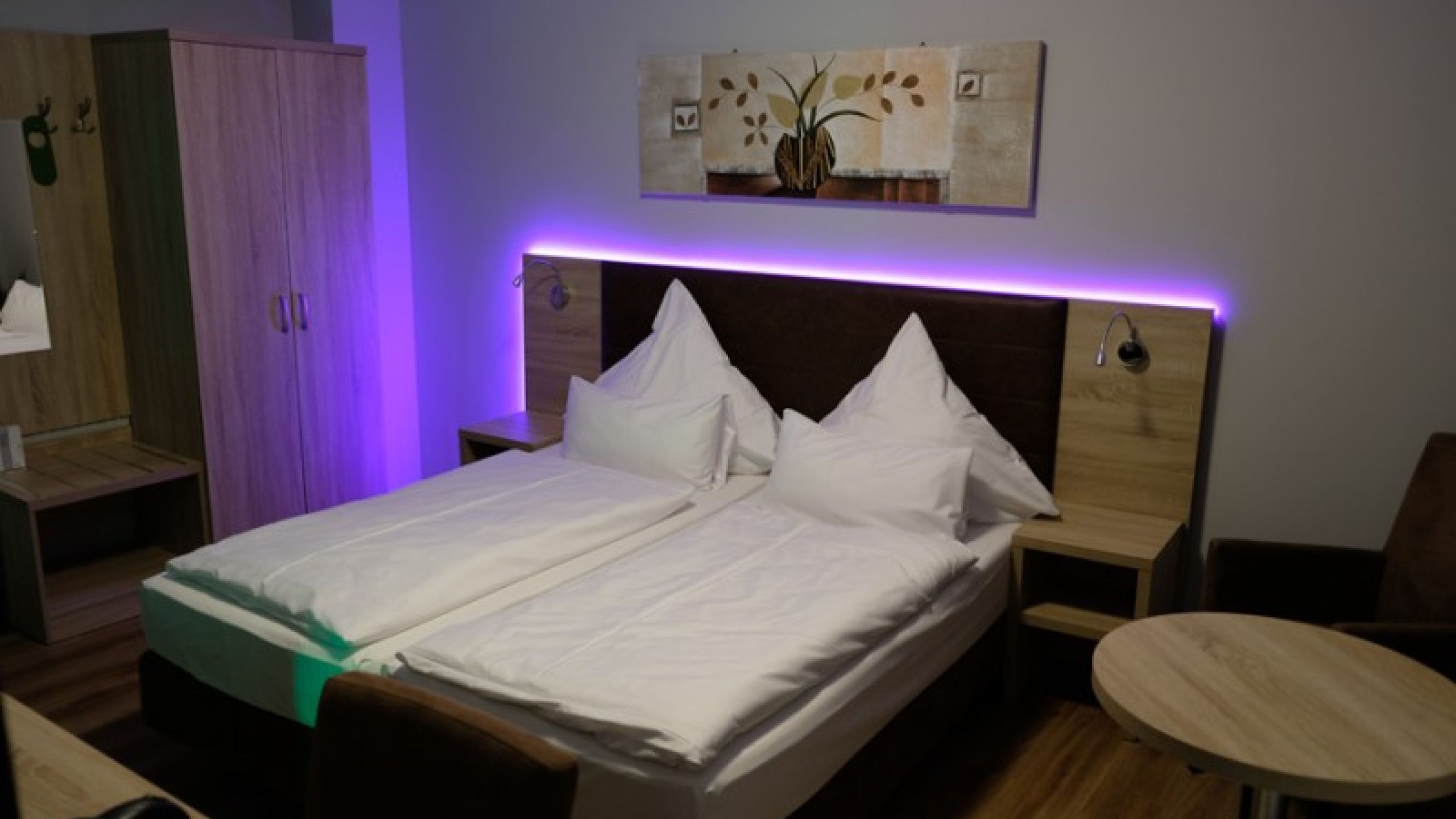In addition, there is an electric kettle in the room, colored LED mood lighting (can be switched off), separate seating, as well as a standing fan in summer.